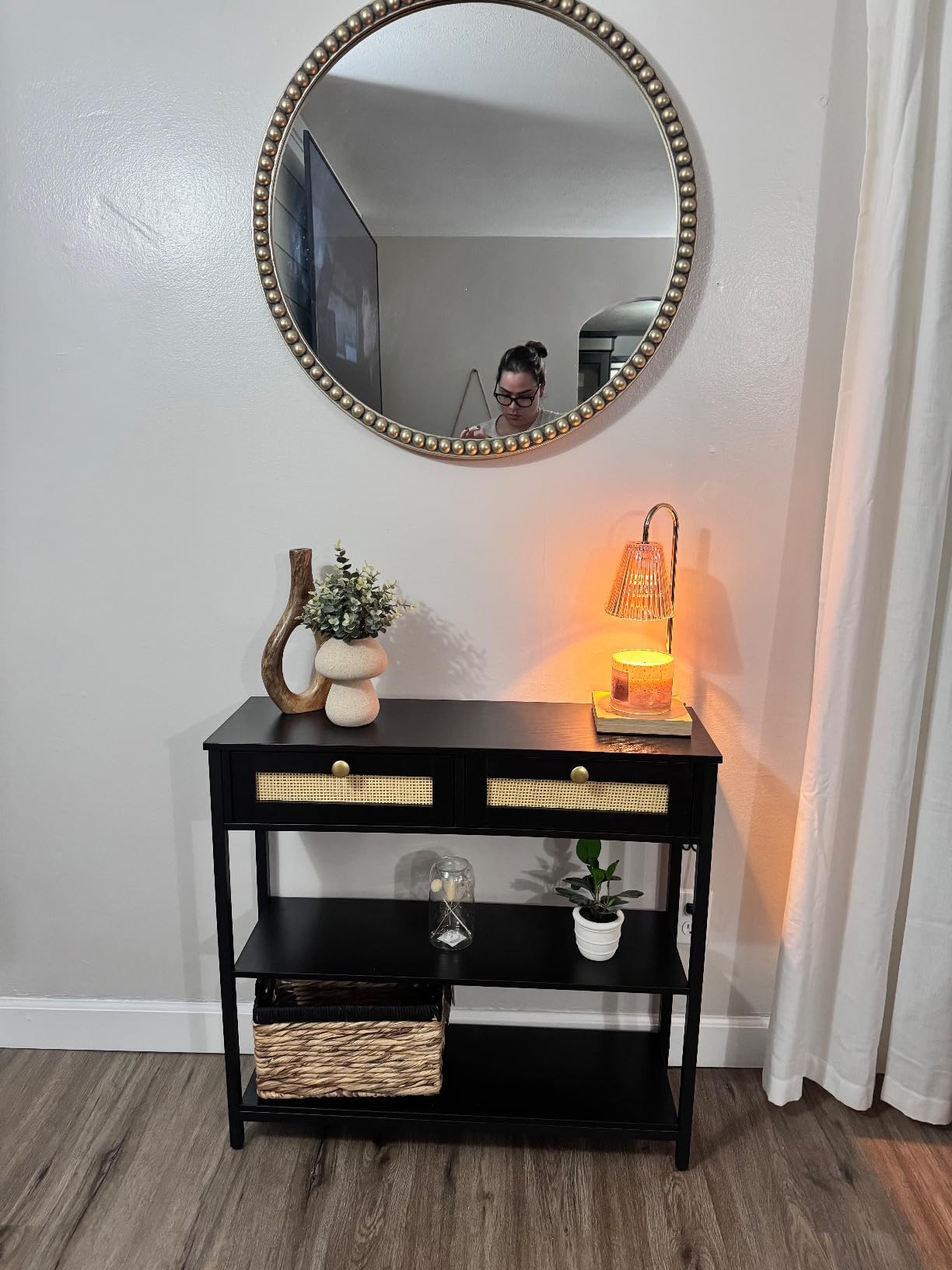 - Console Table with Rattan Elements: With simple lines and a faux rattan door design, the sofa table shows your unique home taste. The understated black panels and frame, with a fresh rattan embellishment, create a sense of modern beauty ideal for any furniture style